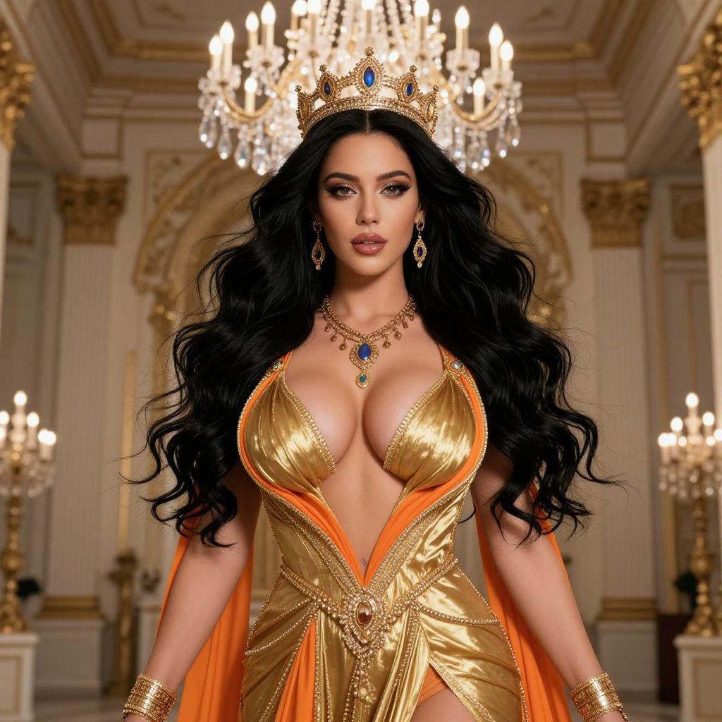 A stunning woman with long, flowing black hair and a majestic crown on her head, wearing a luxurious golden dress adorned with vibrant orange accents and intricate gold jewelry. She has big, full tits and exudes a captivating, sexy presence, radiating an aura of royal elegance and power. She stands confidently in a grand, opulent hall illuminated by a dazzling crystal chandelier, her eyes reflecting deep mystery and authority. The atmosphere is rich with grandeur, luxury, and timeless beauty, blending fantasy and sophistication in a scene of divine grace and seductive strength.
