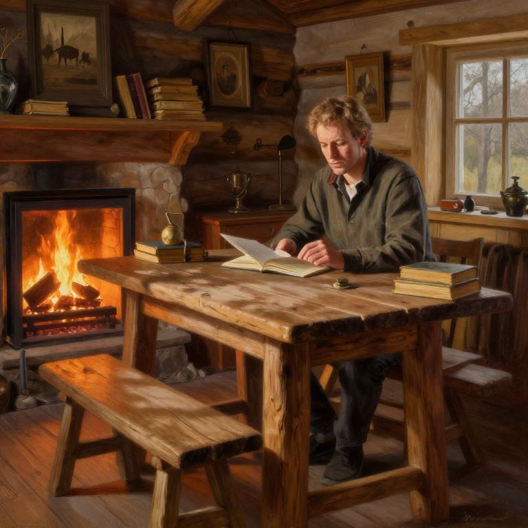 Andersson sitting at a rustic wooden table in a cozy cabin, warm fireplace light casting shadows, surrounded by old books and artifacts, detailed interior design with natural elements, intimate and peaceful atmosphere, painterly style