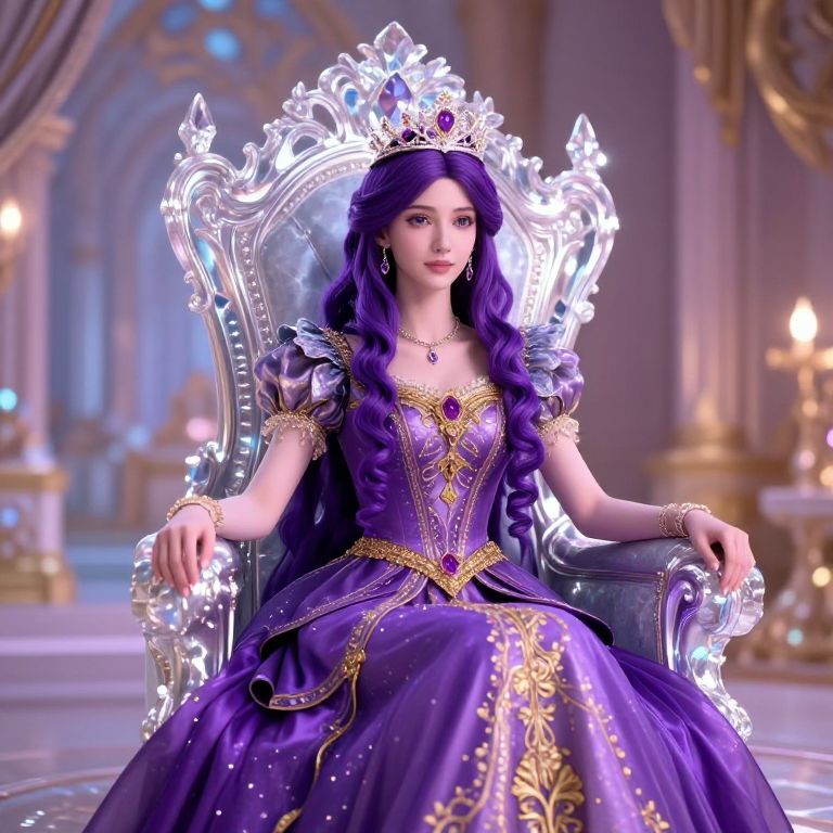 Digital art of a regal woman with long purple hair, wearing a detailed purple and gold gown, and a silver crown, sitting on an ornate