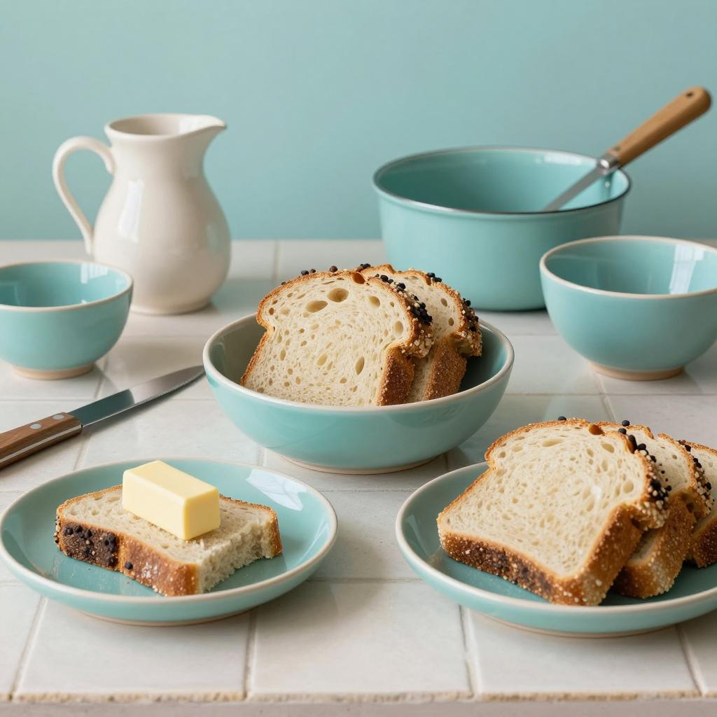 Slices of rustic bread placed on turquoise ceramic plates and bowls with matching cookware. A butter knife and a small ceramic jug with a wooden-handled knife are set on a tiled tabletop against a turquoise background, creating a cozy, vintage kitchen atmosphere.