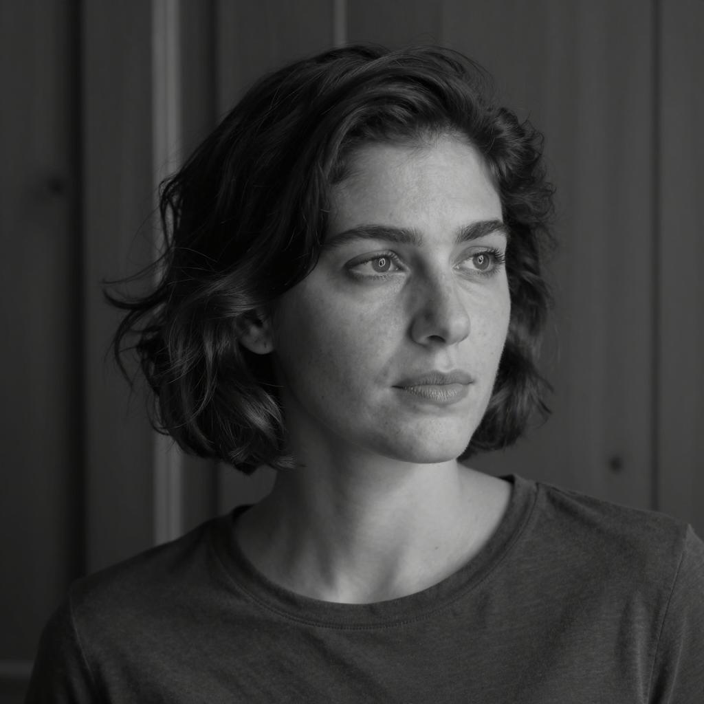 Black-and-white photograph of a woman with short, wavy dark hair, wearing a simple dark shirt. She has a neutral expression, looking slightly to the right. Background shows dark, blurred wooden panels. Light highlights her facial features.