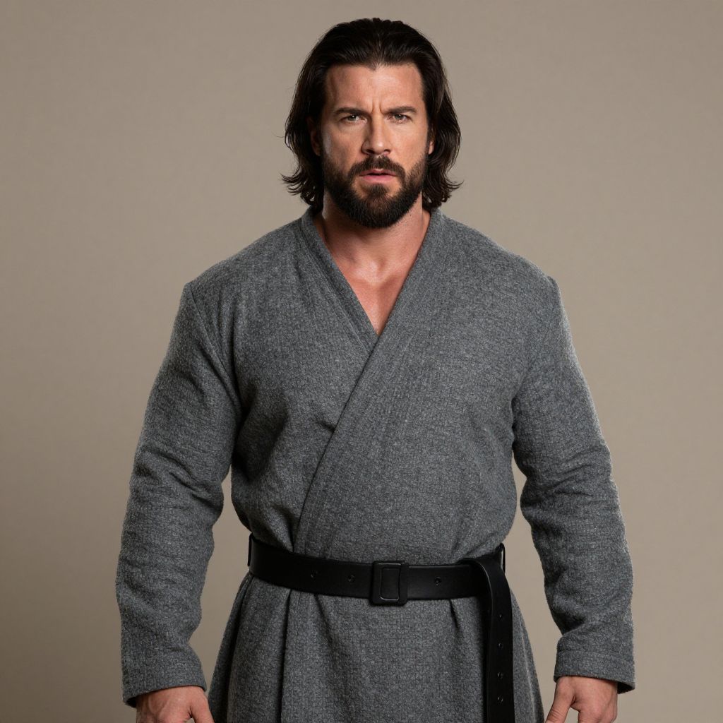 Photograph of a rugged, bearded man with medium-length dark hair, standing against a plain beige background. He's wearing a thick, gray, textured robe with a black leather belt. His serious expression and slightly parted lips add a touch of intensity. The robe's fabric looks coarse, and the belt is simple and functional. Lighting is soft, highlighting his strong, muscular build.