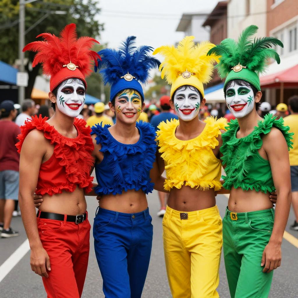 Photograph of four colorful, gender-fluid individuals in a vibrant street parade. They're wearing face paint, elaborate feathered headdresses, and bright, mismatched costumes (red, blue, yellow, and green). Their makeup is bold with white face paint and red lips. They're standing close together, smiling, with a bustling city street and blurred crowd in the background. The image has a playful, energetic vibe.