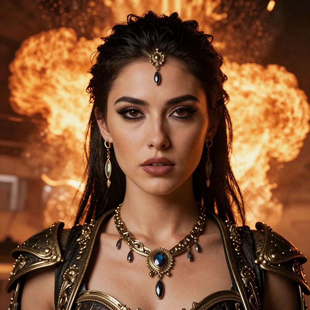 A dramatic, hyper-realistic portrait of a woman with fiery explosions in the background, showcasing extreme ornamental detail and advanced photographic techniques.