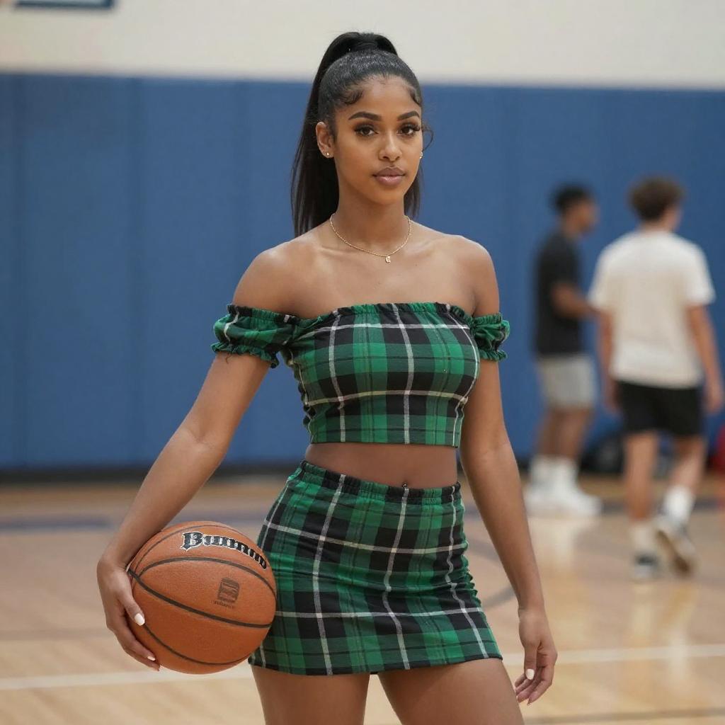 Photograph of a young woman with dark skin and curly hair, wearing a blue and yellow basketball jersey, white socks with red patterns, and white sneakers. She sits on a shiny black floor, legs spread, holding an NBA basketball in front of her. Behind her, a marble wall with two bottles and bright windows.