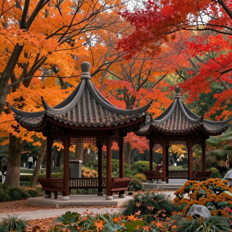 Pavilions nestled in a serene park during autumn, surrounded by vibrant orange and red foliage, intricate wooden architecture with curved roofs, soft sunlight filtering through the trees, peaceful atmosphere, ultra-detailed, realistic style.