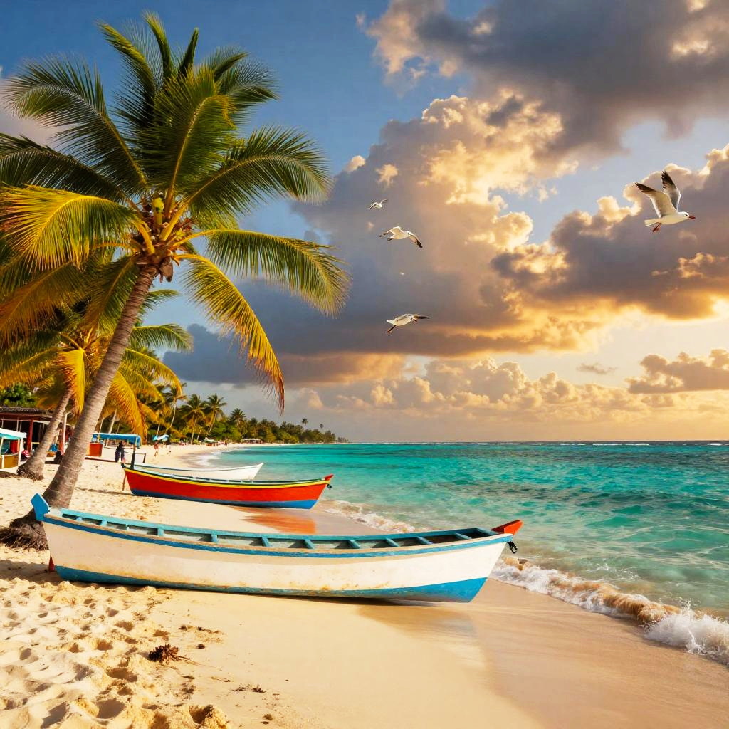 Caribbean vibrant beach scene at sunset with turquoise water, swaying palm trees, colorful wooden boats, and golden sands, under a dramatic sky with fluffy clouds and seagulls, in a tropical paradise setting, highly detailed and photorealistic.
