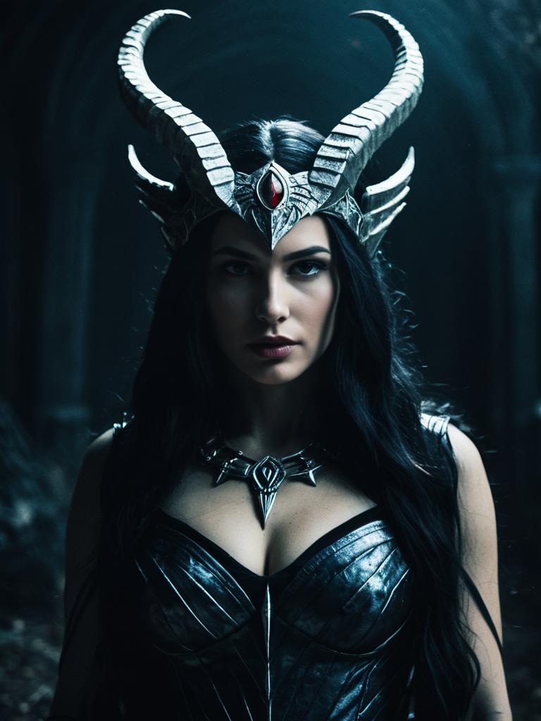 Woman in Lilith Goddess Costume, cinematic realism, dark magical portrait