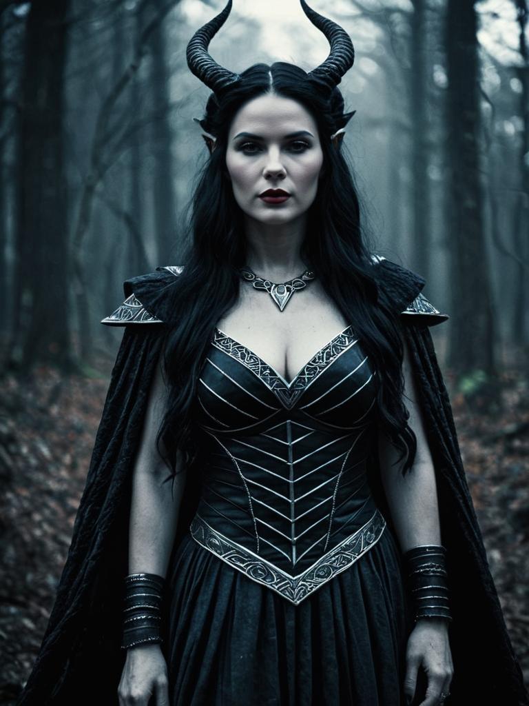 Portrait of a woman wearing a detailed dark Lilith goddess costume, featuring large twisted horns, pointed ears, and intricate silver designs on a black corset and cape. The scene is set in a misty forest, creating a cinematic, dark magical atmosphere.