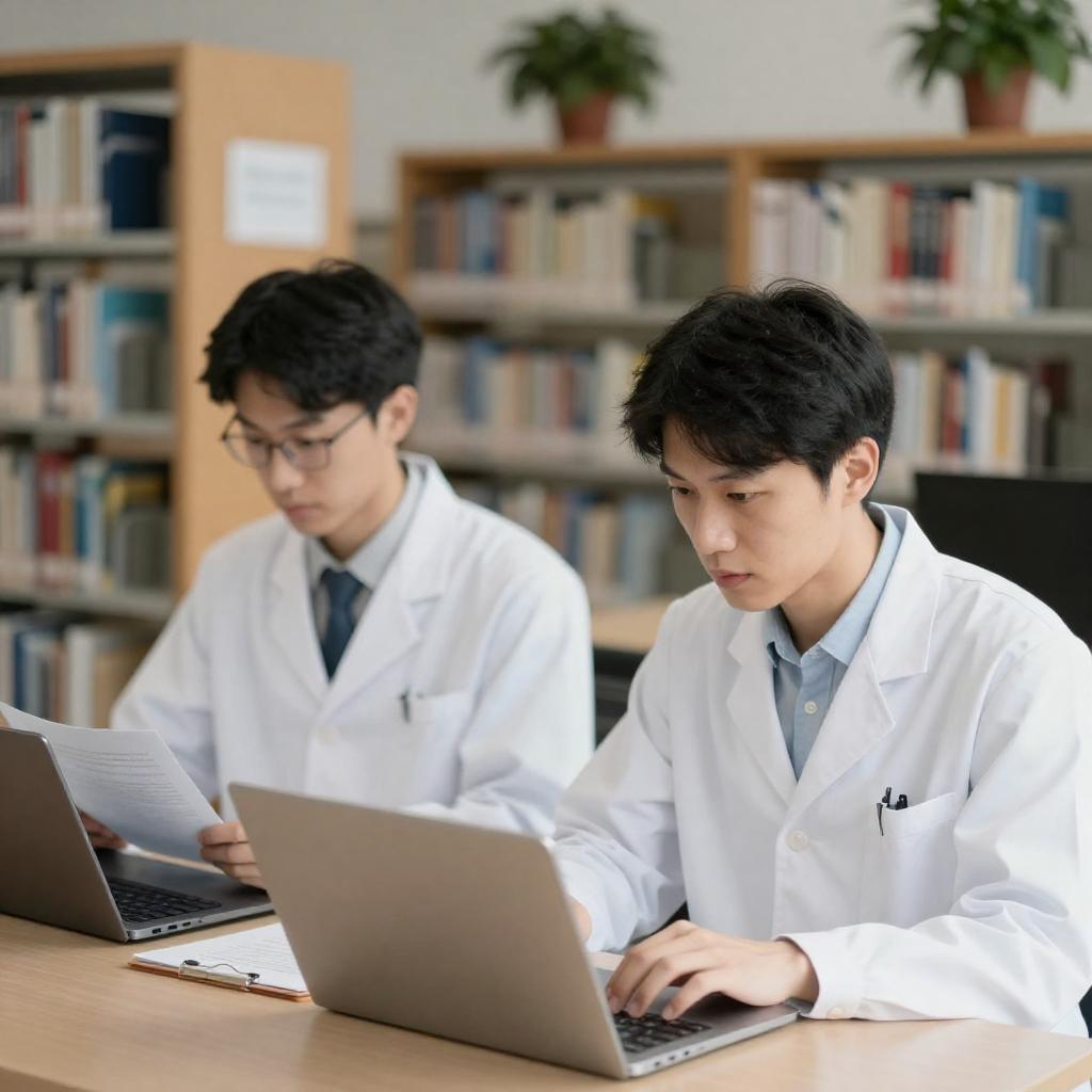 Young Man in Scrubs Working at Desk