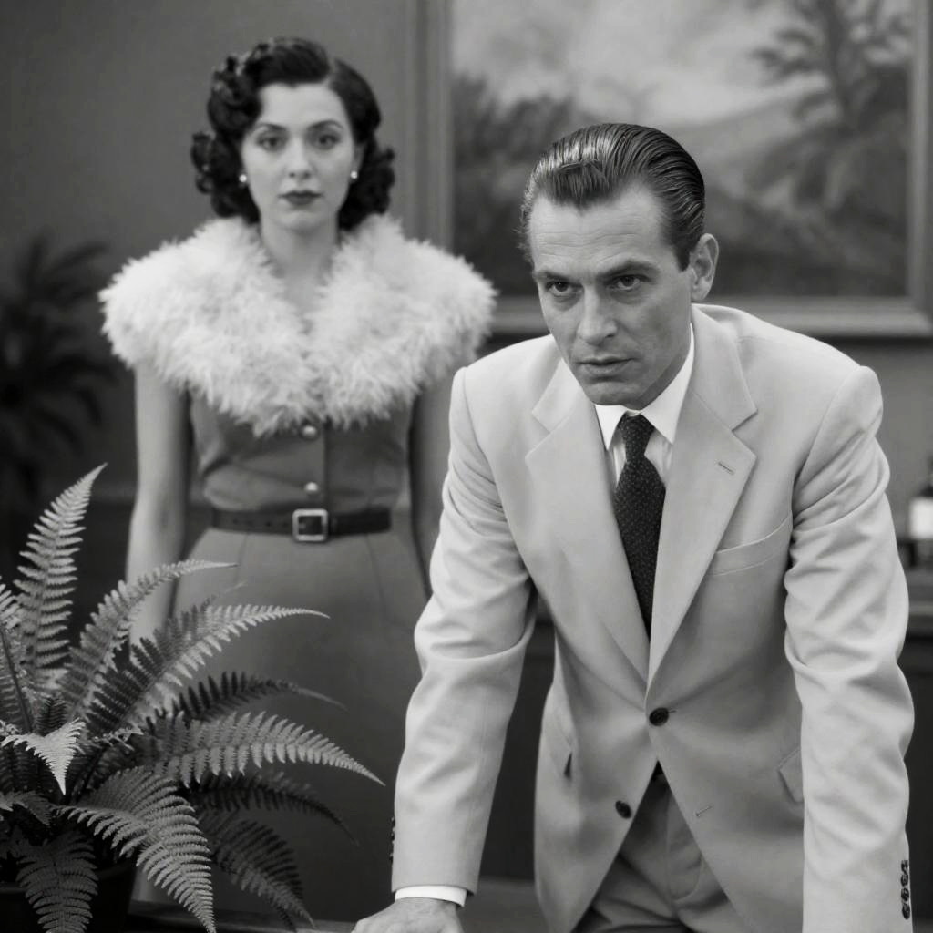 Black-and-white photograph of a man in a dark suit with a patterned tie, holding a newspaper, gesturing with his right hand, standing beside a woman in a light, floral-patterned dress, seated in an ornate chair. She has dark, wavy hair and a serious expression. Background includes a wooden cabinet and patterned wallpaper.