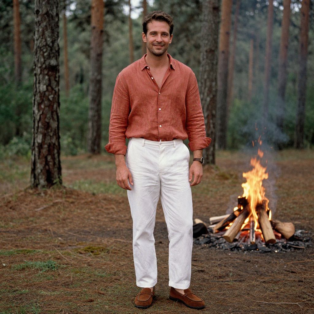 A man, rustic terracotta linen button-up, half-tucked, breathable white cotton trousers, casual brown suede loafers, warm earthy palette, laid-back elegance, tall pine trees, soft mossy ground, crackling campfire glow, AgfaColor film, relaxed smile. Man has masculine face and piercing eyes