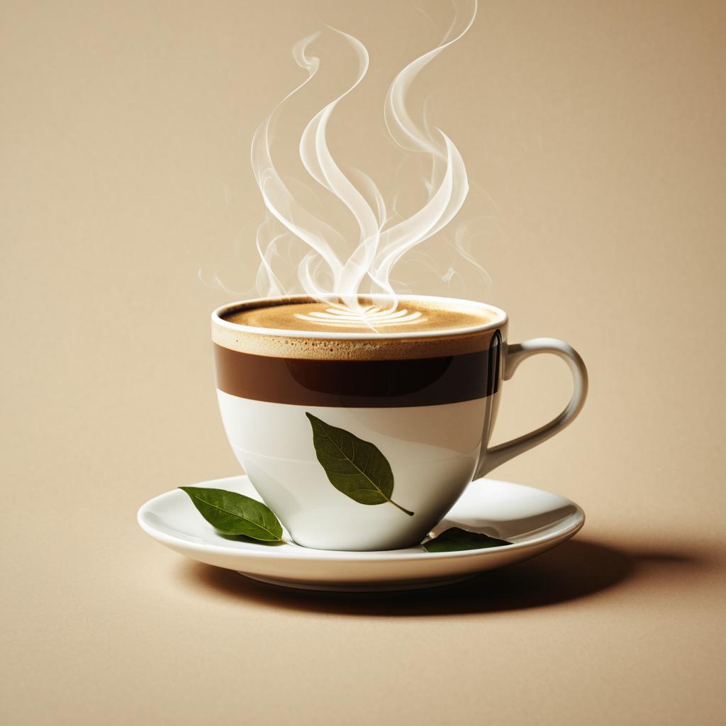 An illustration of a steaming coffee cup in flat style with a small leaf design in the ice, in the style of deep brown and warm cream, stock photo, fawncore, consumer culture critique, intricate yet minimalistic