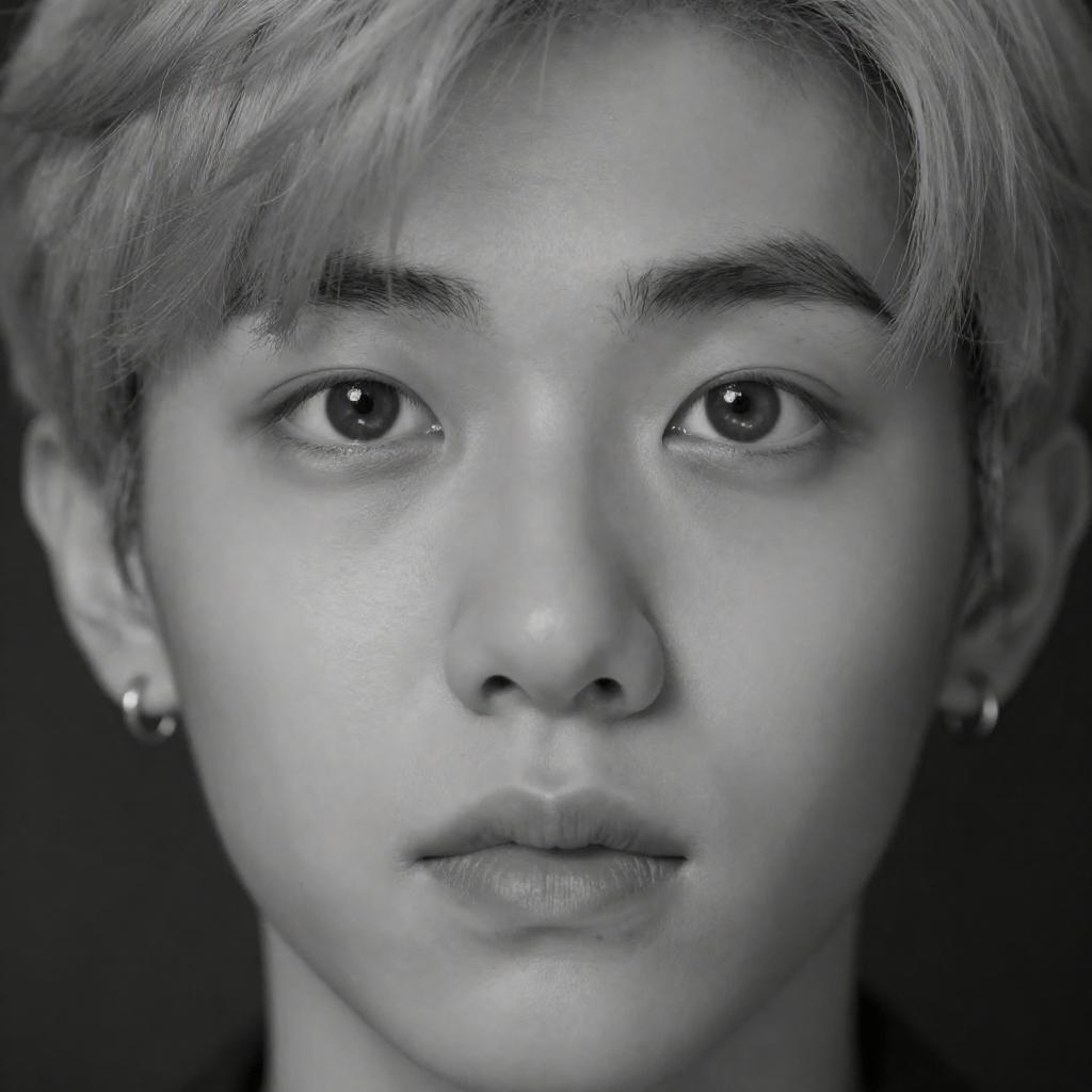 Black and white close-up portrait of a young person with short, light-colored hair, smooth skin, and neutral expression. The individual has intense, wide eyes looking slightly upward and wears a small hoop earring in the left ear. The image highlights subtle facial details and soft natural lighting with slight shadows under the eyes.