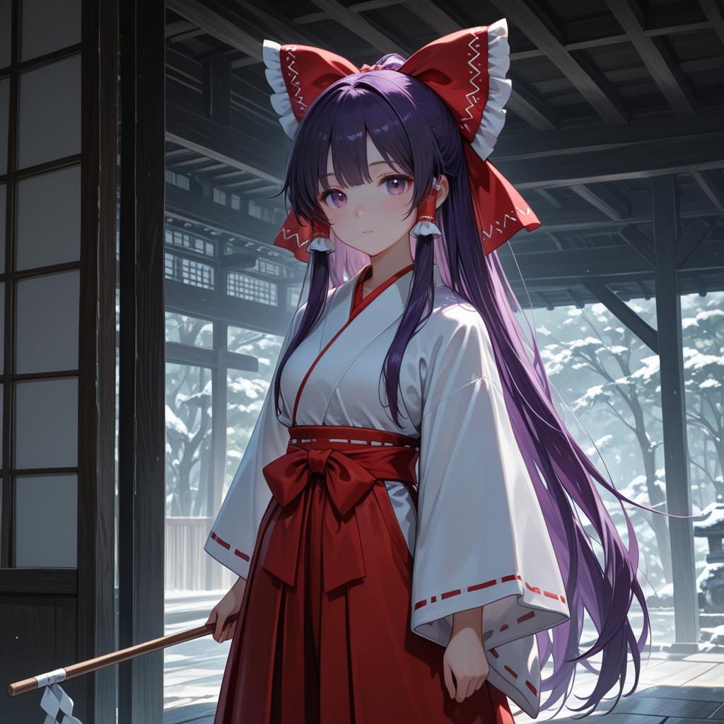 Hakurei reimu (pc-98), touhou, 1girl, purple eyes, purple hair, long hair, very long hair, sidelocks, hair bow, hair tubes, white kimono, white kimono, red bow, long sleeves, wide sleeves, miko, miko, gohei, red hakama, by artist lazyprocrastinator, dark_illustrious