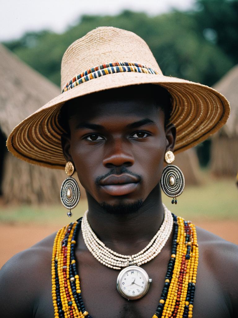 Portrait of a young African man wearing traditional Ghanaian attire, featuring a large straw hat, elaborate beaded necklaces in yellow, black, and red, a unique wristwatch-style pendant, and ornamental circular earrings. The background shows a blurred rural setting with huts, emphasizing cultural heritage.