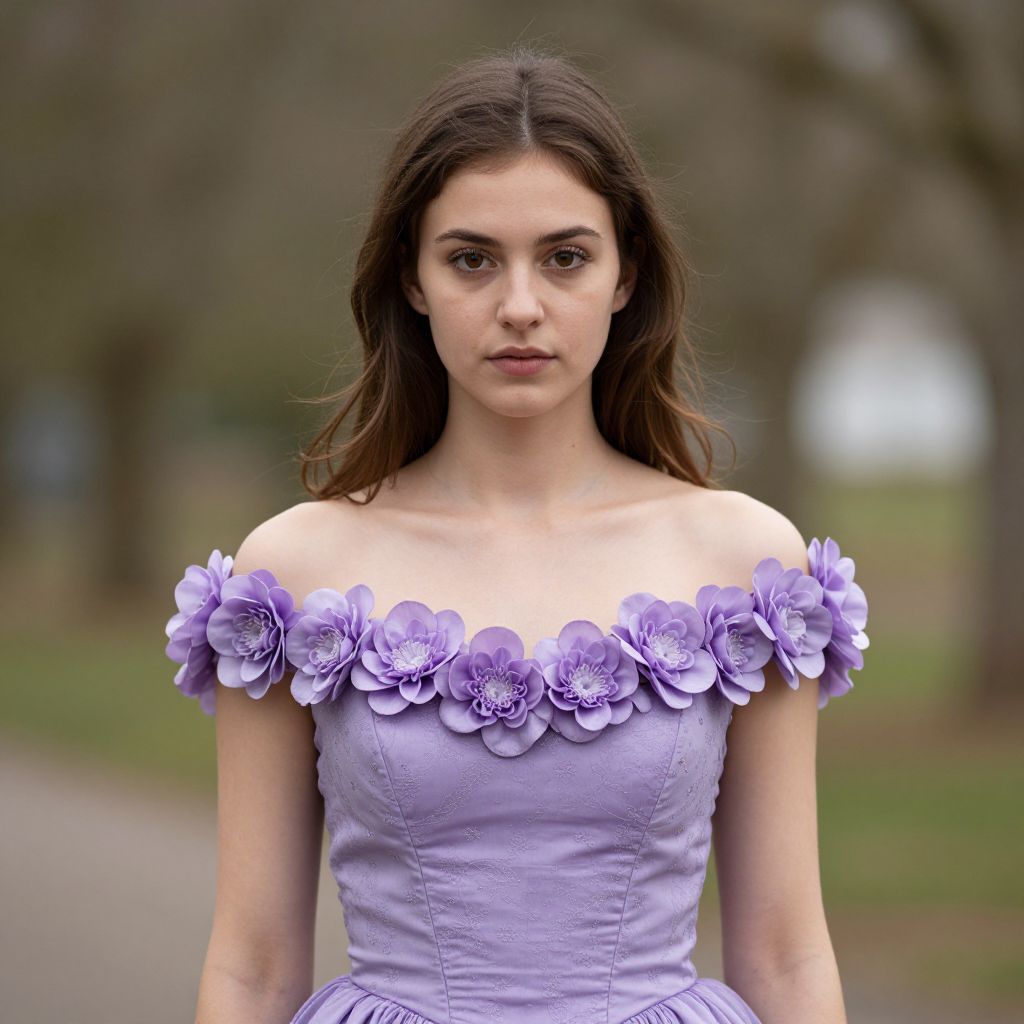 Photograph of a young woman with fair skin and long brown hair standing outdoors in a blurred park setting. She has a serious expression and is wearing a lavender off-the-shoulder dress adorned with large, textured, flower-like fabric accents along the neckline. The dress fits her slender frame, with visible seams adding structure. The background features indistinct trees and a path, with muted green and brown tones. The overall color palette is soft and natural, with the lavender dress providing a striking contrast. The image has a realistic, slightly dramatic style.