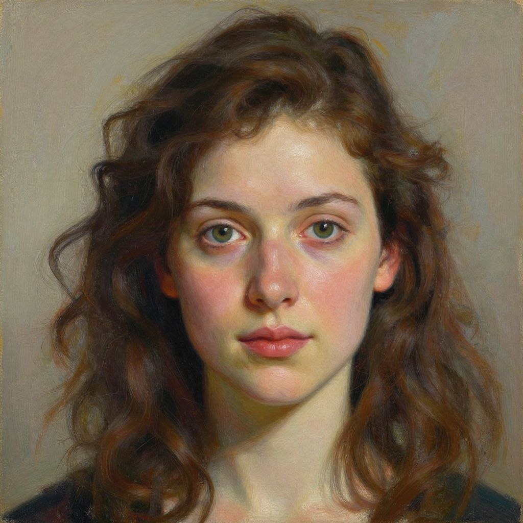Portrait of a young woman with curly brown hair, green eyes, and a soft expression, rendered in vivid detail by Lucian Freud in 'The Painter's Mother II.'