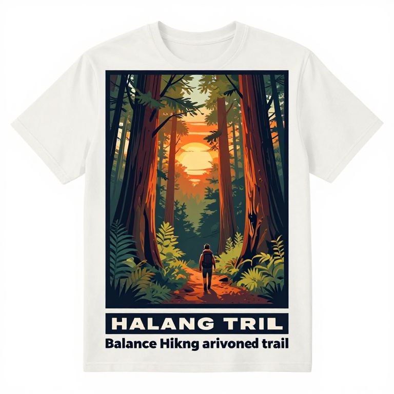 "Balance Hiking trail amidst redwood trees, vintage travel poster, adventurous and inspiring, warm sunset glow, T-shirt design graphic, vector, contour, white background.,"