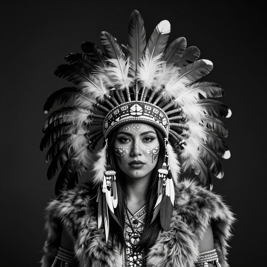 The image presents a striking, black-and-white portrait of a woman adorned in a futuristic, indigenous-inspired outfit. Her headpiece, a magnificent array of feathers, stands tall and proud, symbolizing a connection to nature and the earth. The feathers are meticulously detailed, with varying shades of gray and white, adding depth and texture to the scene. The woman's face is painted with intricate patterns, reminiscent of traditional indigenous face paint, enhancing her regal and powerful appearance. She wears a fur-like garment that complements her headpiece, further emphasizing her connection to the natural world. The overall composition is balanced, with the woman's face and headpiece being the focal points, while the fur garment adds a layer of depth and texture. The background is dark and muted, ensuring that the woman's attire and features remain the central focus of the image. The use of black and white enhances the dramatic effect, highlighting the contrast between the woman's attire and the dark background. The image evokes a sense of futurism and indigenous pride, blending traditional elements with modern aesthetics.