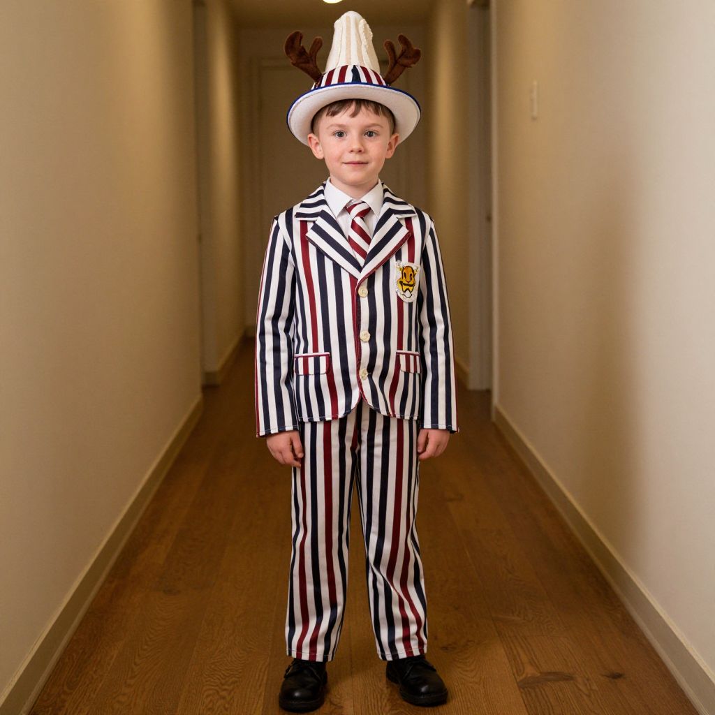 Kid Tweedle Dee Dum Costume, boy in a striped suit and hat standing in a hallway