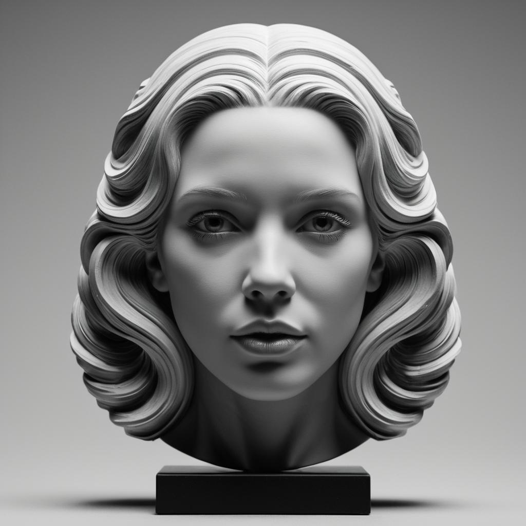 Hyperrealistic 3D resin miniature sculpture of a woman’s head with symmetrical facial features and wavy hair. The artwork is inspired by academic art styles of Jean-Baptiste Carpeaux and Antonio Corradini, rendered in high detail with ray tracing and subsurface scattering techniques. Displayed on a simple pedestal against a clean background.