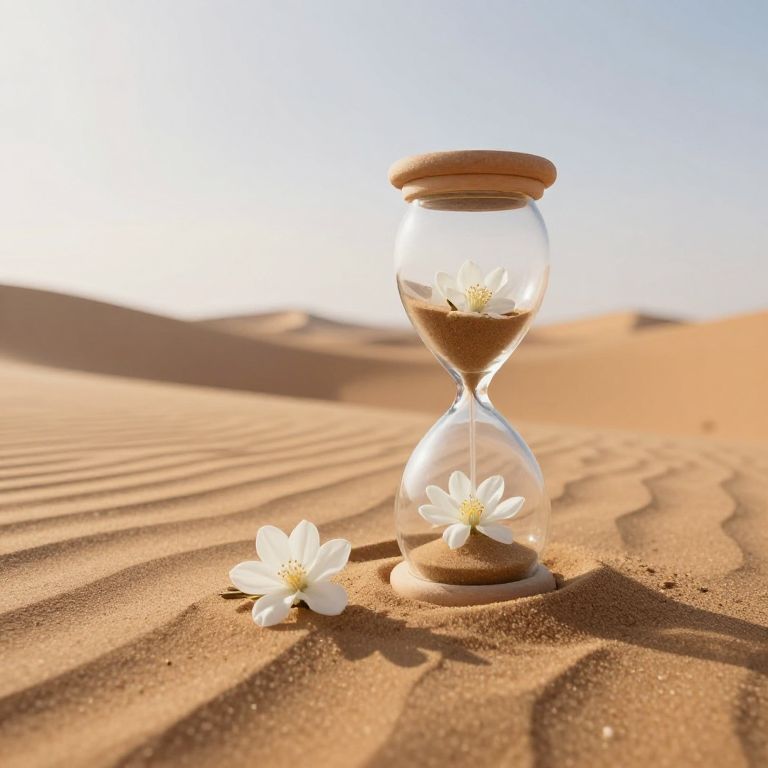 Sand-dusted hourglasses rest serenely atop rippling dunes, their glass chambers cradling delicate white flowers that bloom amidst cascading grains of golden sand under a serene desert sky.