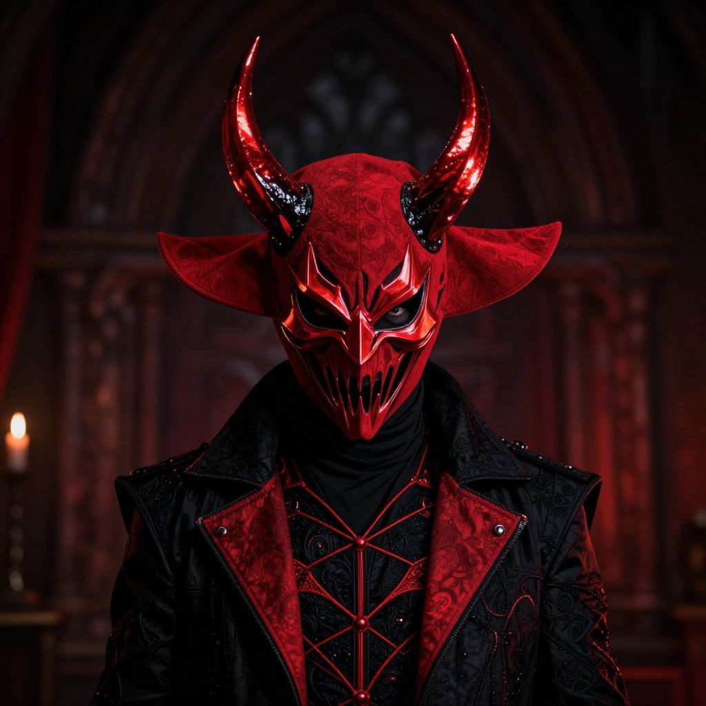 A person wearing a detailed black and red costume with a menacing mask covering their face, the mask featuring sharp, angular features and glowing red accents. The individual is also adorned with a large red hat topped with exaggerated, pointed horns that shimmer slightly under the light, giving an eerie, fantastical atmosphere. The scene is set in a dark, gothic environment with soft ambient lighting, emphasizing the dramatic contrast between the vibrant red and deep black colors. The person stands confidently, eyes visible through the mask's slits, exuding a mysterious and powerful presence.