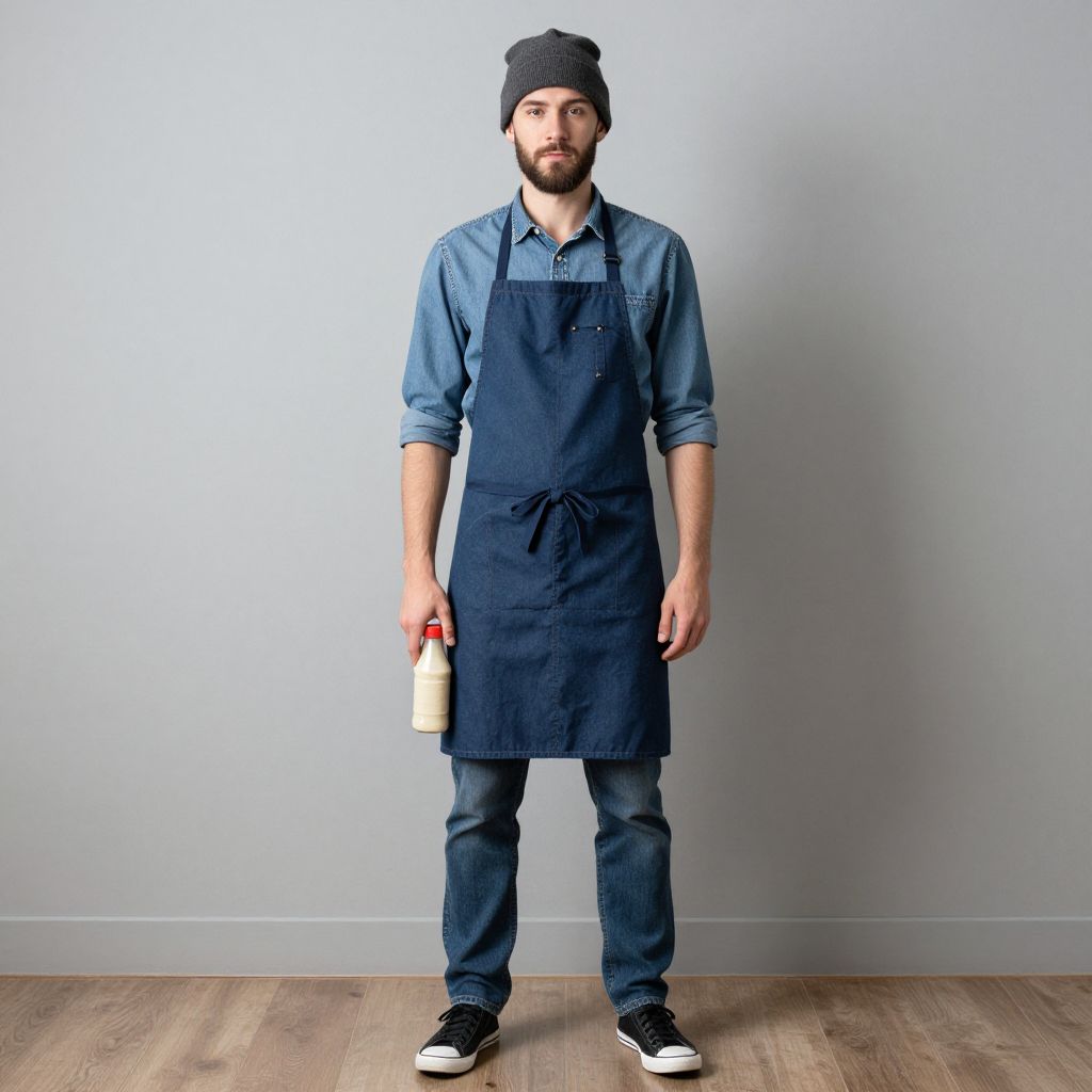 Photograph of a bearded man standing against a plain light gray wall. He has a light skin tone, short brown hair, and wears a black beanie, blue button-up shirt with sleeves rolled to the elbows, and a dark blue apron tied at the waist. He also wears blue jeans and black and white sneakers. In his right hand, he holds a white bottle with a red lid. The floor is wooden with a light brown finish. The lighting is soft, creating minimal shadows. The overall style is casual and modern.