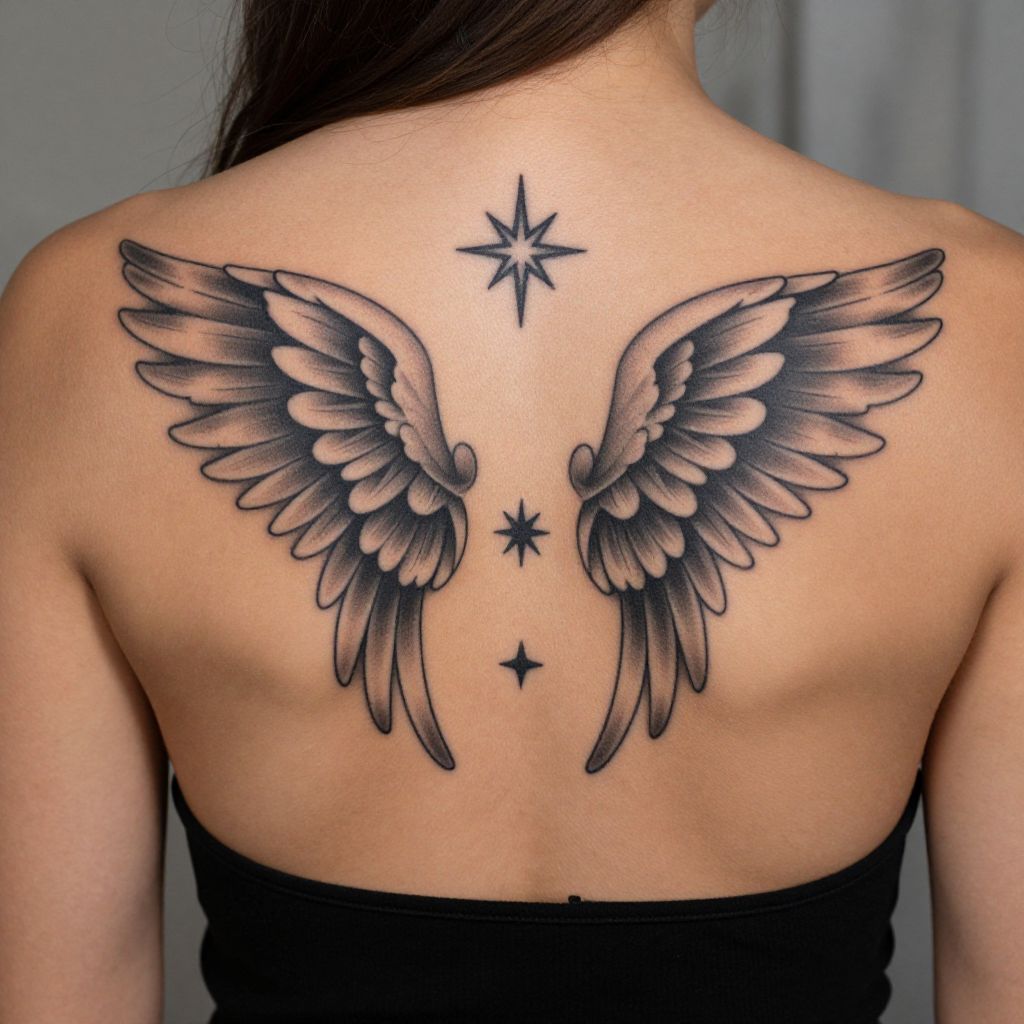 A photograph of a woman's back showing a black tattoo of symmetrical angel wings with a star at the top and two smaller stars below the wings. The wings are detailed with fine lines and the stars are solid. She's wearing a black, low-cut top, and her skin is a light tan. The background is blurred and gray.