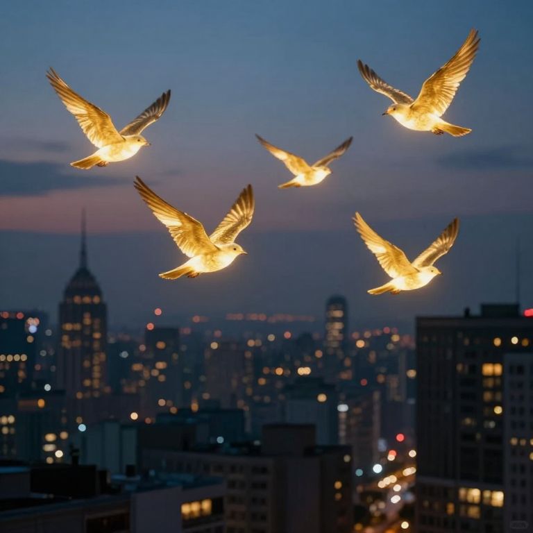 Amidst the hushed whispers of a twilight metropolis, luminous birds take flight, their golden wings carrying the weight of unspoken dreams and the promise of transcendence, as the city below hums with the quiet pulse of life and longing.