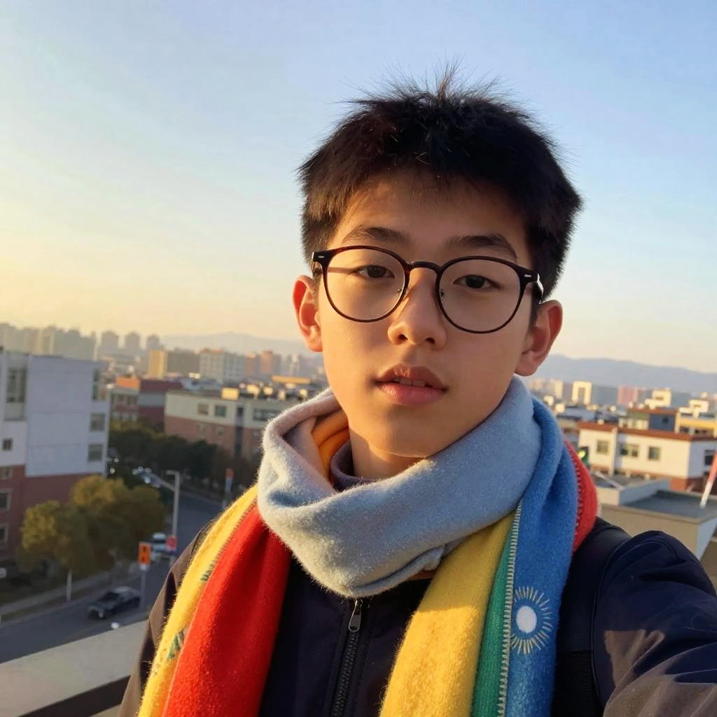 14 year old selfie, creative angle, warm golden hour glow, vibrant scarf and glasses, artistic background with blurred cityscape, youthful and energetic mood