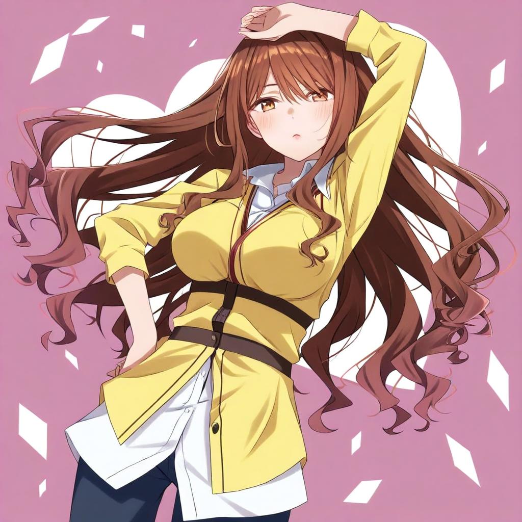 Digital anime-style illustration of a young woman with long, flowing brown hair and brown eyes. She wears a yellow jacket over a white shirt, paired with dark pants. The character has a confident pose with one hand resting on her head and the other on her hip, set against a pink background with white geometric shapes.