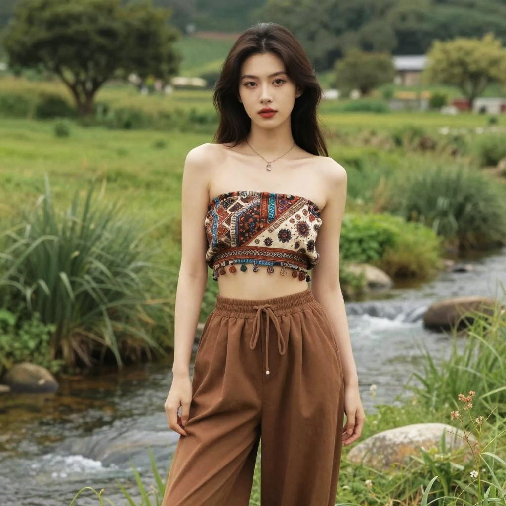 A Svelte woman in a bohemian chic style, wearing a strapless crop top with ethnic prints and high-waisted brown wide-leg trousers, stands at a gentle brook in the meadow, surrounded by lush greenery, in a shogakukan visual style. Sexy. Pretty face and beutiful eyes