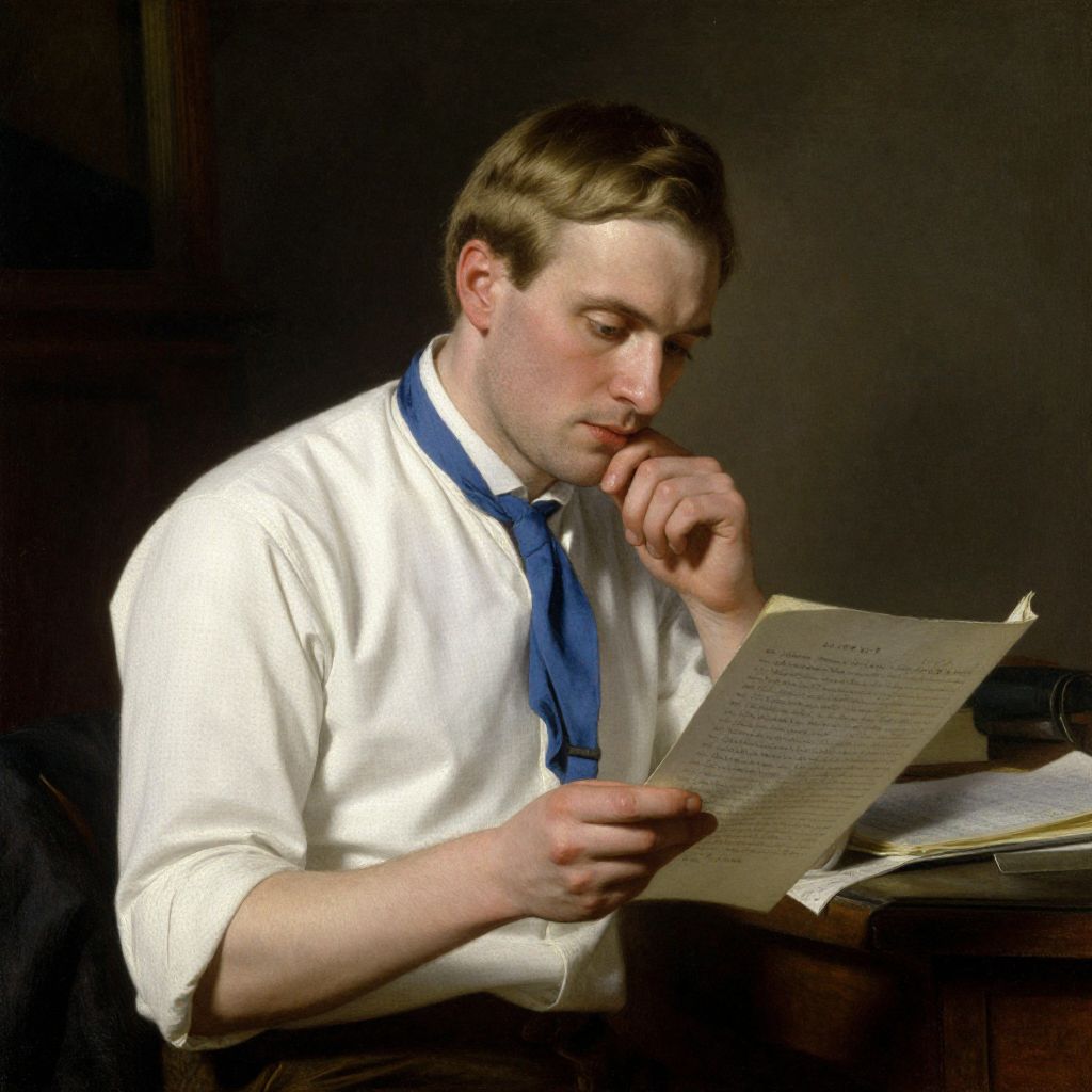 In this 1800s painting, a man with neatly combed blonde hair and a determined expression is deeply engrossed in a document he holds in his hands. His attire, consisting of a white shirt with rolled-up sleeves and a blue tie, suggests a formal yet practical approach to his work. The document, held in his left hand, appears to be a list or a set of notes, with visible text and numerals that hint at its importance. The man's right hand rests thoughtfully on his chin, emphasizing his concentration. The background, though dark and somewhat blurred, hints at an indoor setting with wooden elements, possibly a desk or a table. The overall composition, with the man positioned centrally and the document held close, draws the viewer's attention to his focused gaze and the significance of the paper he is examining.