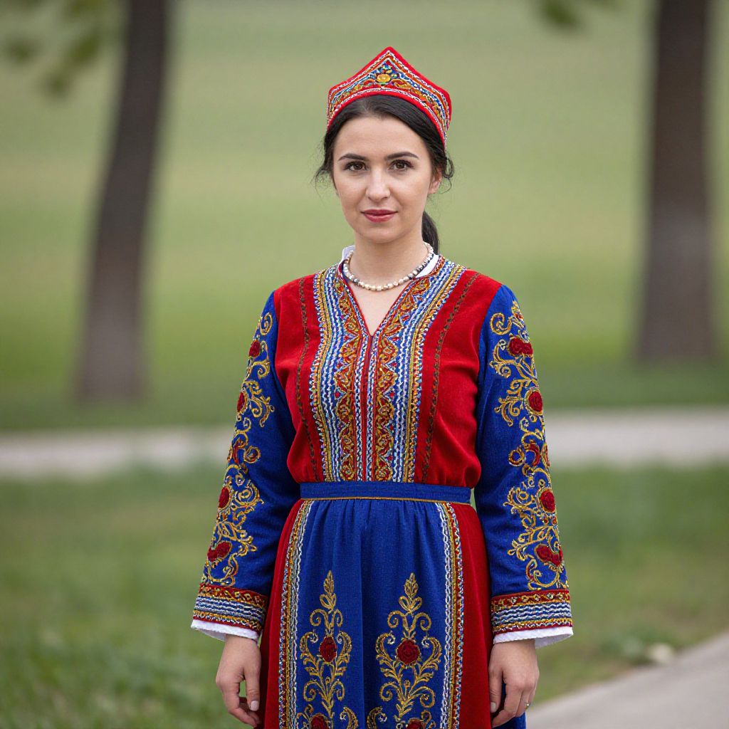 "Serbian Folk Clothing, woman in a red and blue dress and a red hat"