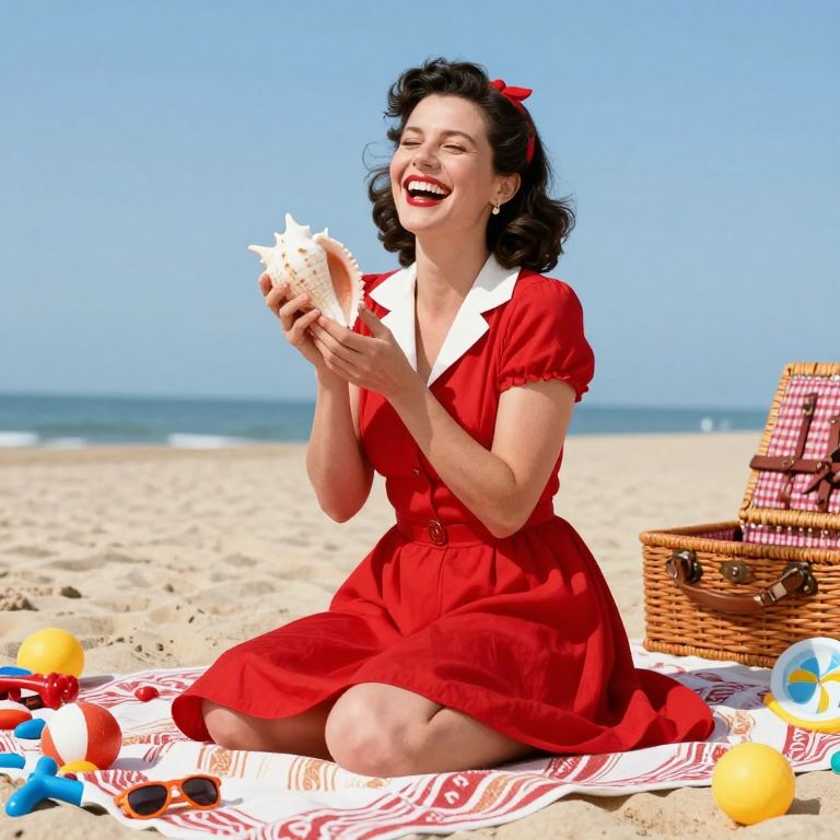 A lady in a vintage-style red dress sitting on a patterned beach towel, laughing while holding a seashell, surrounded by scattered beach toys and a picnic basket nearby, under a clear blue sky