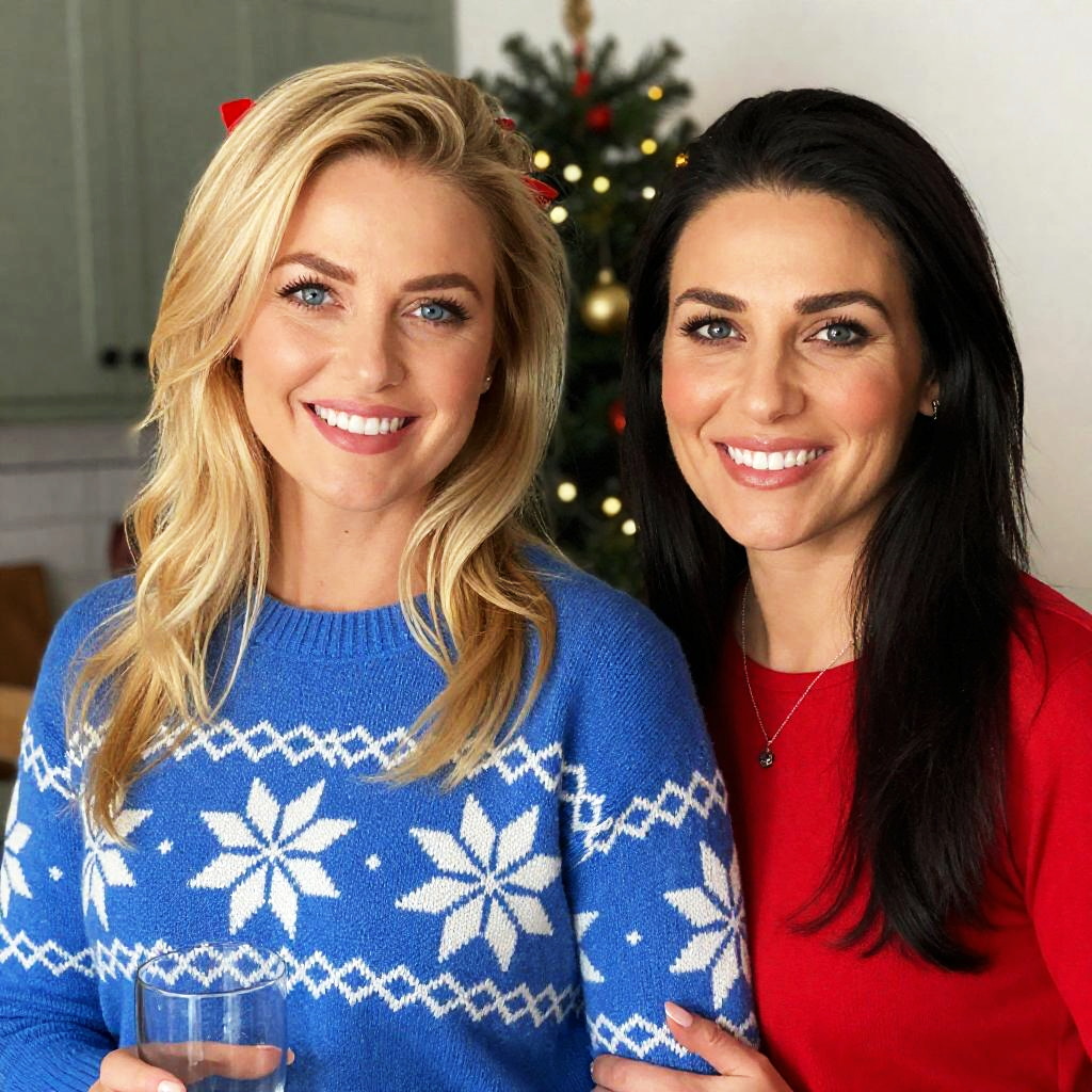 Photograph of two women standing in a festive room. Left woman with long brown hair, wearing brown cowboy hat, beige and black vest over cream top, smiling slightly. Right woman with blonde hair, wearing pink patterned dress with long sleeves, smiling broadly. Christmas tree with red, blue, and gold ornaments on right. White paneled wall in background. Both women standing, hands clasped in front. Warm lighting.
