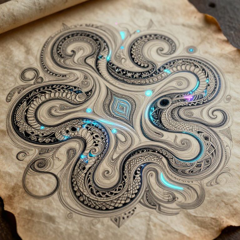 Scrollwork AI generating intricate, hand-crafted patterns with flowing serpentine lines and delicate geometric motifs, rendered in ethereal digital ink on a ancient parchment background, neon highlights, cyber-fantasy style, detailed texture, high resolution, 8K cinematic.