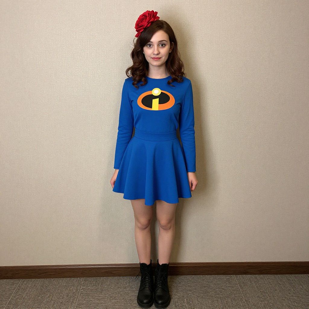 "incredibles female costume, 1girl, solo, hair flower, flower, skirt, hair ornament, standing, boots, full body, looking at viewer, blue skirt, indoors, rose, long sleeves, closed mouth, jacket Realistic photo of casual sexy person with pretty face"