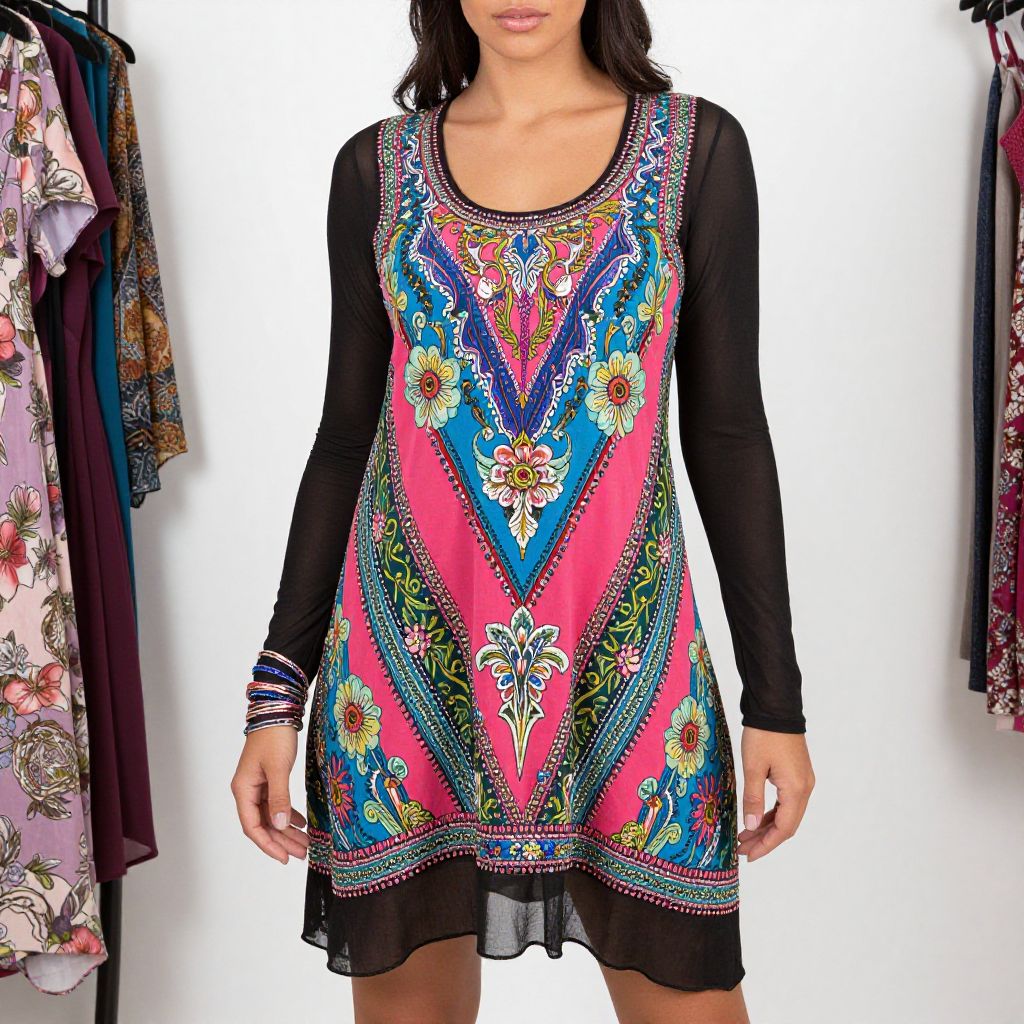 "Woman, bohemian, sleeveless shift dress with a vibrant mix of pink, blue, and green colors, ornate floral and abstract motifs, scoop neckline, knee-length, layered over a black sheer long-sleeve underdress, embellished with small sequins and beaded accents, stacked bracelets, white background in a retail setting.. Sexy. Pretty face and beаutiful eyes. Big breasts."