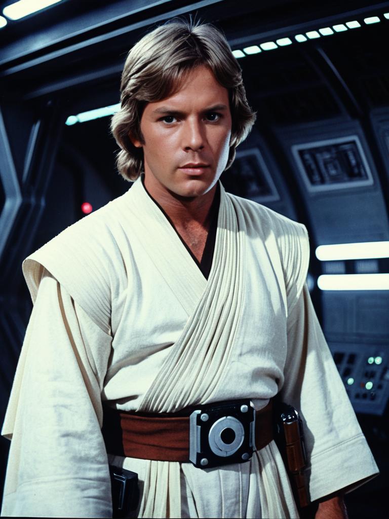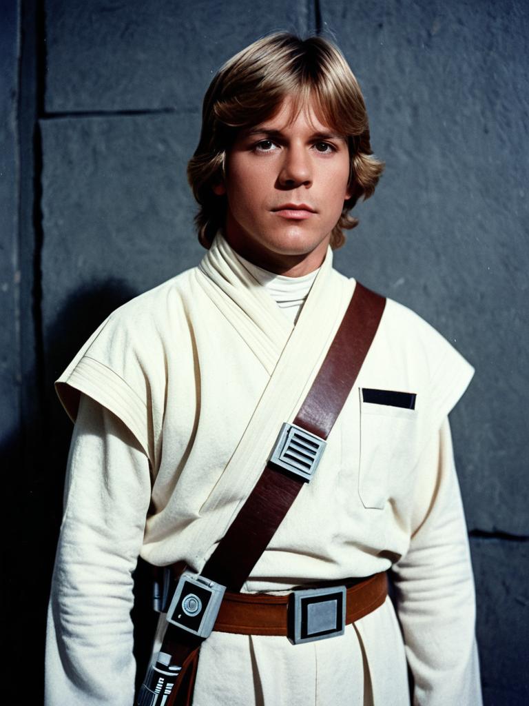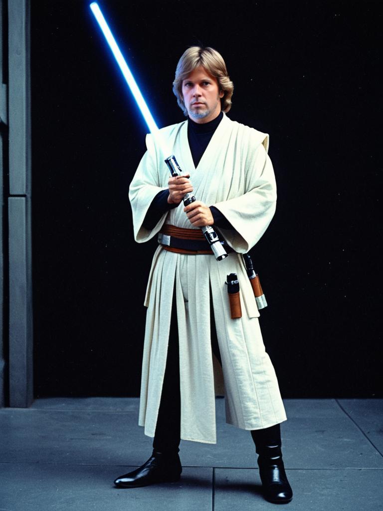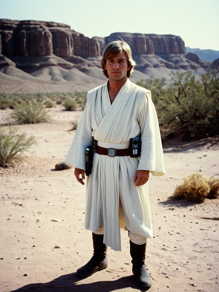 Man in Luke Skywalker New Hope Costume, cinematic realism, dramatic low-angle shot