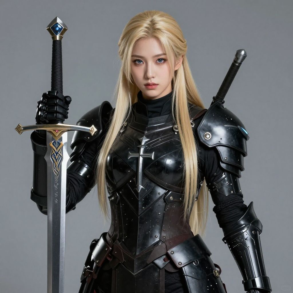 ((masterpiece, best quality, highres, realistic)) Perfect Face, long blonde hair, Futuristic Templar, black armor with Templar cross, (cyber armor)), sword, guns, black armor