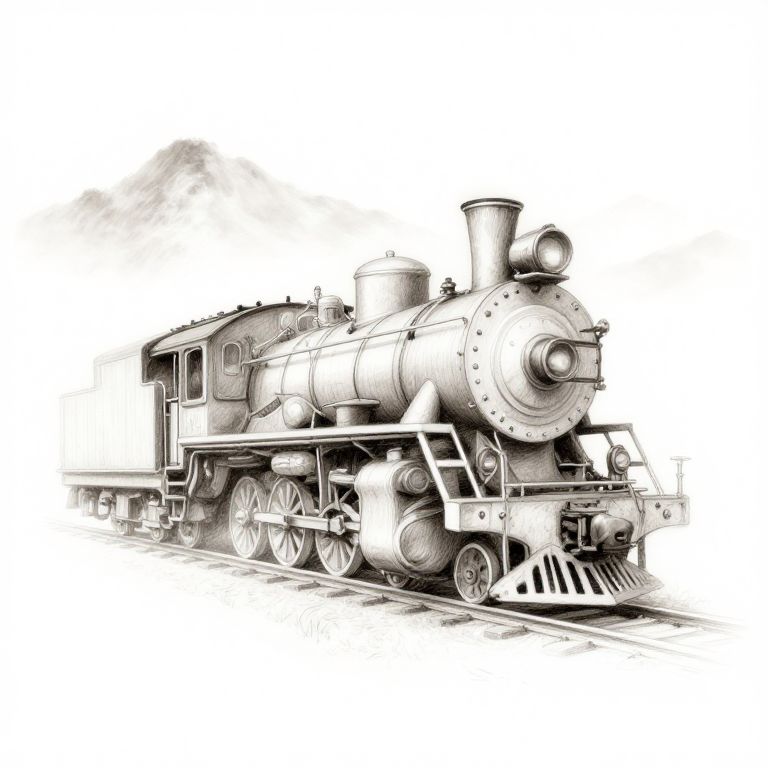 Black-and-white pencil drawing of a vintage steam locomotive on railway tracks, detailed with smokestack, large wheels, and intricate engine design.