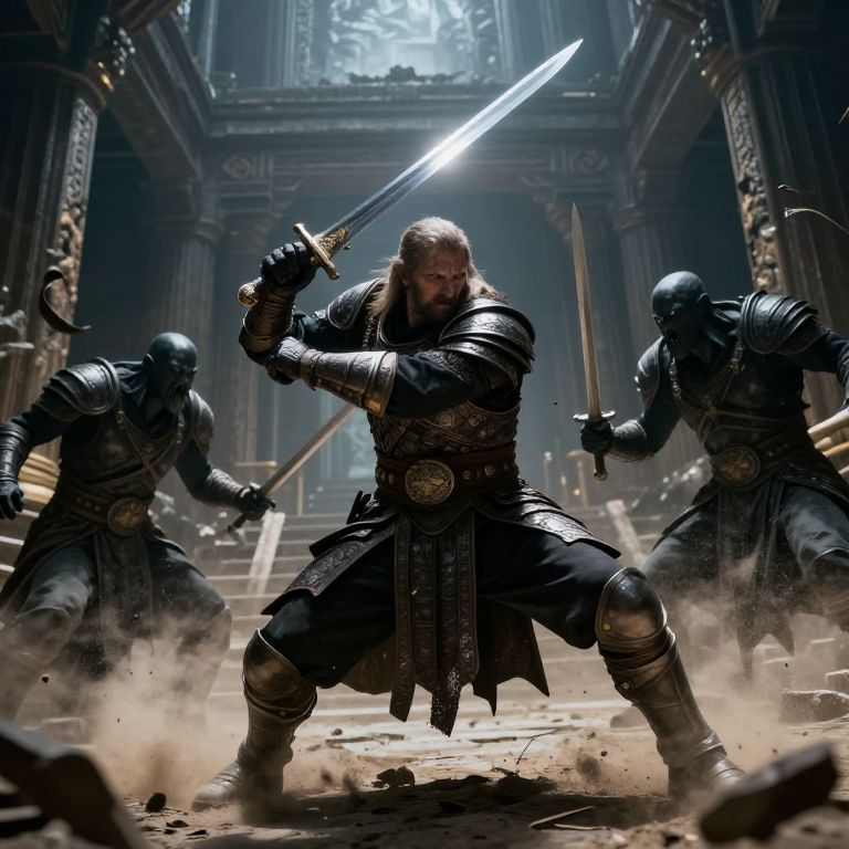 Epic fantasy battle: bearded warrior with glowing sword faces two armored, helmeted foes in a dim, dusty, ancient temple. Dynamic lighting,