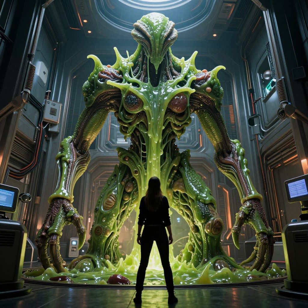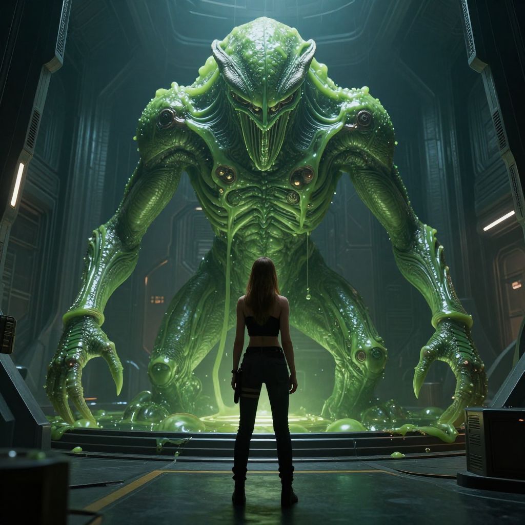 A woman stands in a futuristic facility, facing a large, green, slimy creature with intricate details and dramatic lighting.