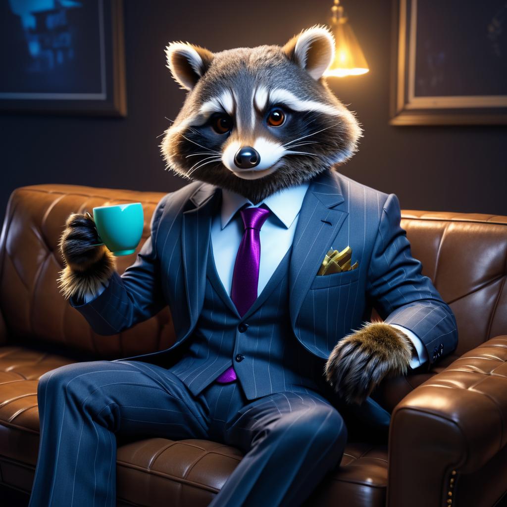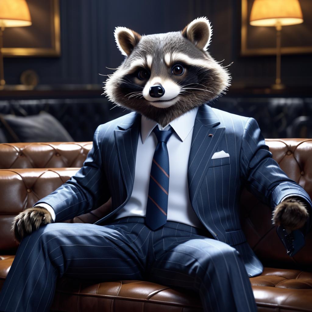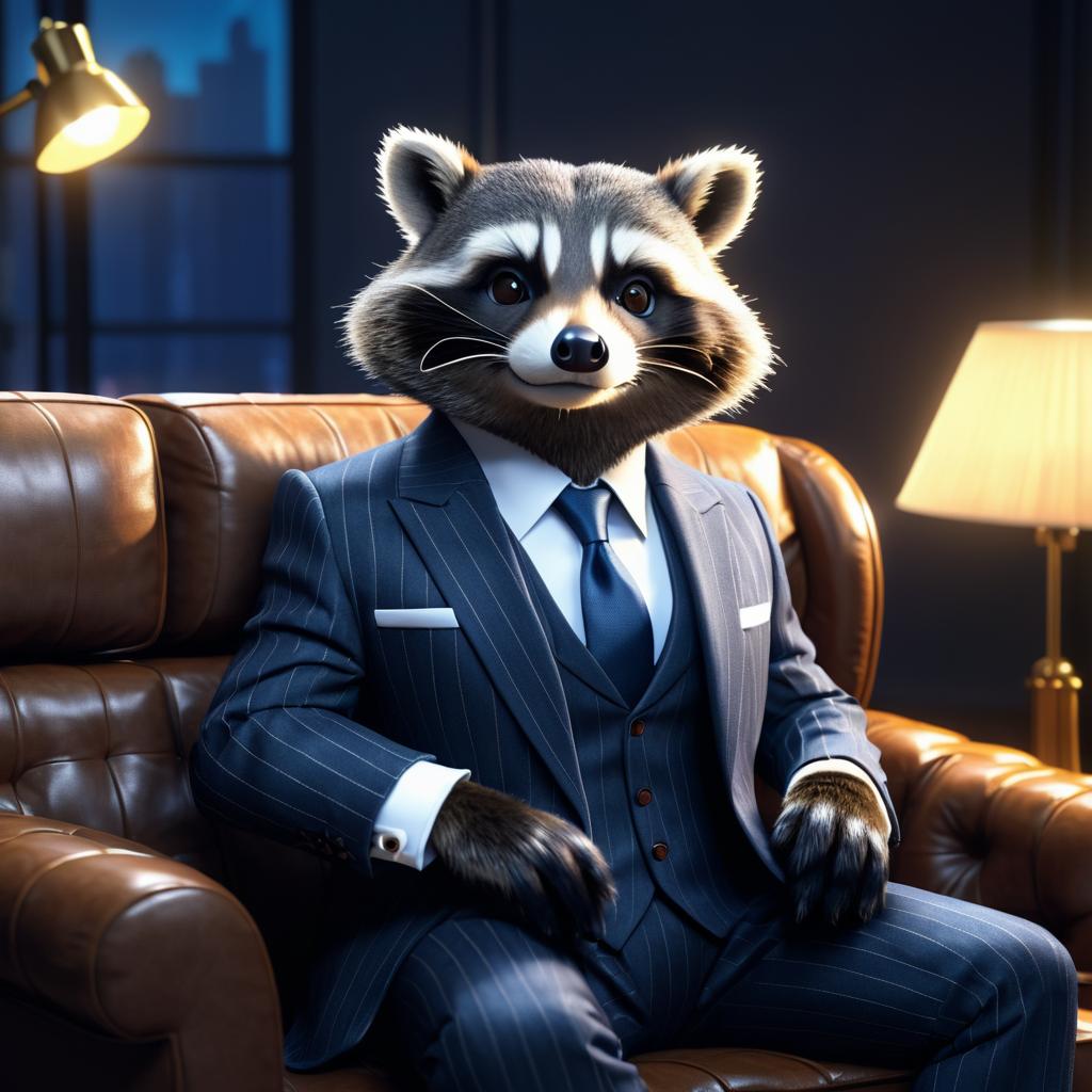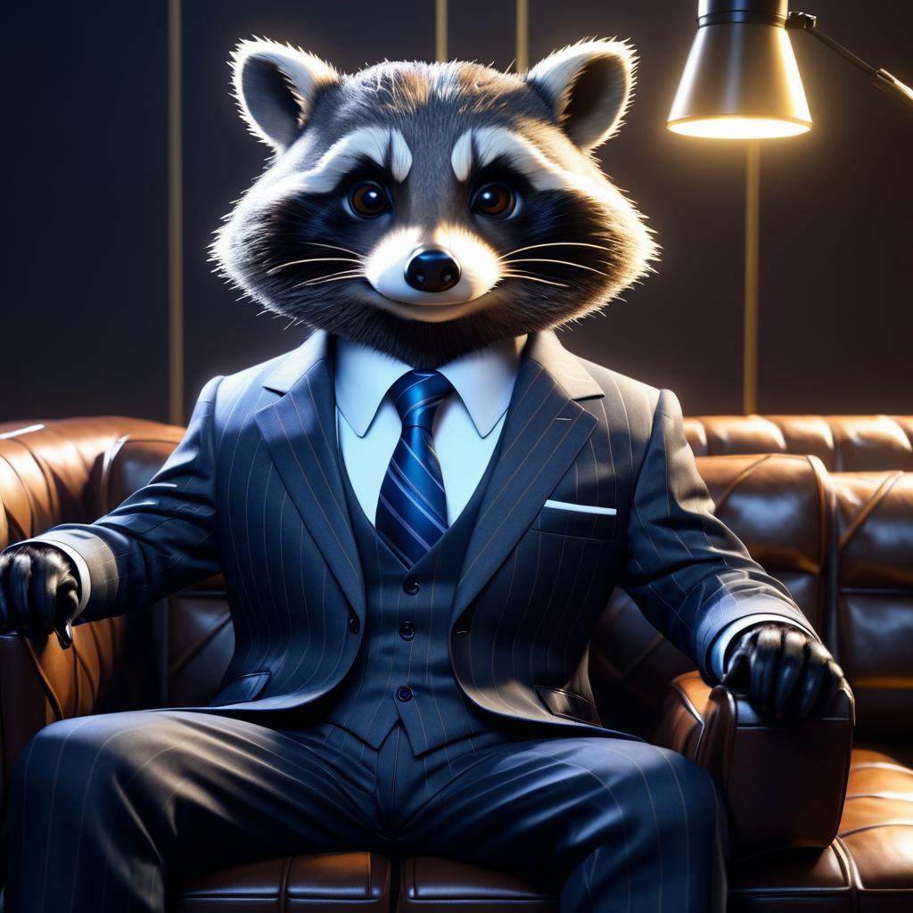 Anthropomorphic raccoon in a suit doing business on a detailed couch. Studio lighting, 8K resolution, trending on ArtStation, video game art style.