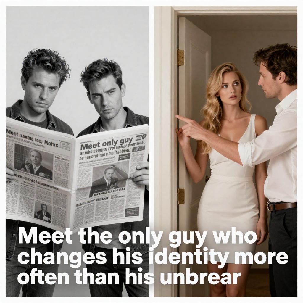 Photograph collage: Left, black-and-white photo of two men holding a newspaper with a serious expression. Right, color photo of a man in a white shirt pointing at a blonde woman in a white dress standing in a dimly lit doorway. Text overlay reads, "Meet the only guy who changes his identity more often than his underwear."