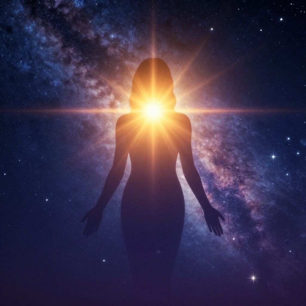 Innate qualities depicted as a radiant inner light shining through a silhouette figure, set against a celestial background with stars and galaxies, inspirational and uplifting mood.