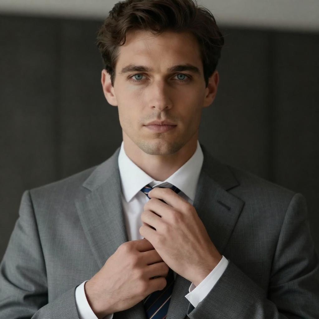 Photograph of a handsome man with dark hair, blue eyes, and light skin, adjusting his striped tie. He wears a gray suit with a white shirt. The background is blurred and dark. He looks intently at the camera.